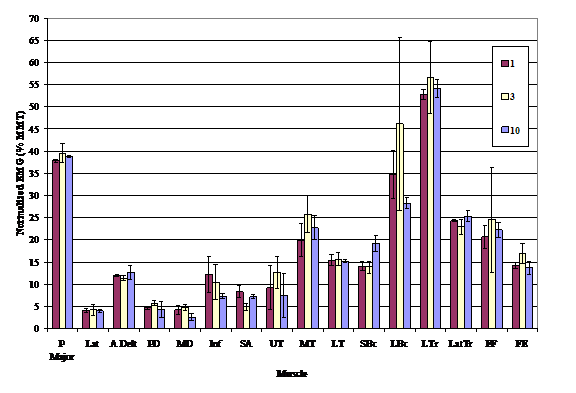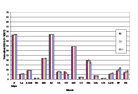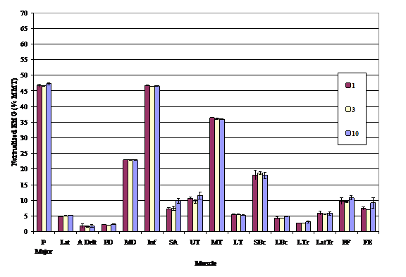 All EMG data was band-passed filtered (10-400 Hz) using a fourth order, recursive Butterworth filter. The root-mean-square (RMS) of the EMG data was binned in 10ms intervals. After normalizing the data to the maximum (filtered and binned) maximum muscle activation during the manual muscle test of each muscle, averages were taken for each muscle over the three seconds of the task, establishing a normalized average RMS value representative of the amount of activity of the muscle during that particular trial. The above process was repeated for all three trials in all three positions for each subject. After getting an average RMS value for all three trials in one position, these values were averaged to represent the average amount of activity of a particular muscle in a particular position. This resulting number was used to express the amount of normalized EMG activity in each muscle expressed as a percent of the MMT task. Standard deviations of the three trial average RMS values were also calculated for each muscle. The data was analyzed in two ways: 1) The amount of muscle activity in positions 1, 3, and 10 (for each muscle) was compared within each subject to determine whether there were “between-task, within subject” differences in neuromuscular control patterns. 2) Muscle activation patterns for each subject were compared to determine if there were “between-subject, within task” differences in the neuromuscular control patterns and whether these differences can be explained through the findings in the kinematics data and physical evaluation.