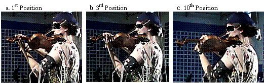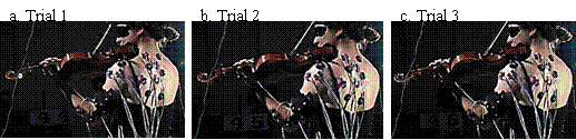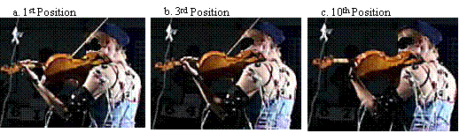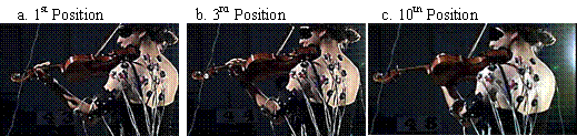 All violin tasks involved depression of the G string along the fingerboard of the violin (specifically 1st, 3rd, and 10th positions; Figure 1). These tasks were selected in that they were expected to impose the greatest demands on the neuromuscular system. Muscle activation patterns of muscles controlling the scapula and left upper extremity were monitored using surface electromyography. Segment kinematics during violin playing were analyzed using digital video. Results of this research provide evidence for identifying techniques for effectively distributing mechanical load during violin playing. The basic foundation of knowledge established in this study will be necessary for designing effective future studies aimed at gaining a more in-depth understanding of the possible causes and treatments that can be put into practice by injured violinists.